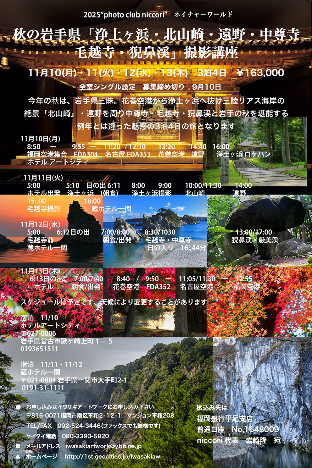 2025 / 11月秋の岩手県「浄土ヶ浜・北山崎・遠野・中尊寺/毛越寺・猊鼻渓」