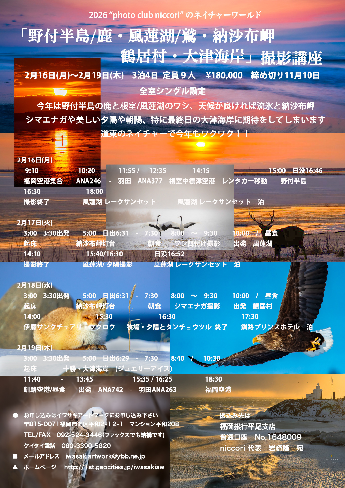 「野付半島/蝦夷鹿・風蓮湖・鷲・納沙布岬・鶴居村・大津海岸」撮影講座